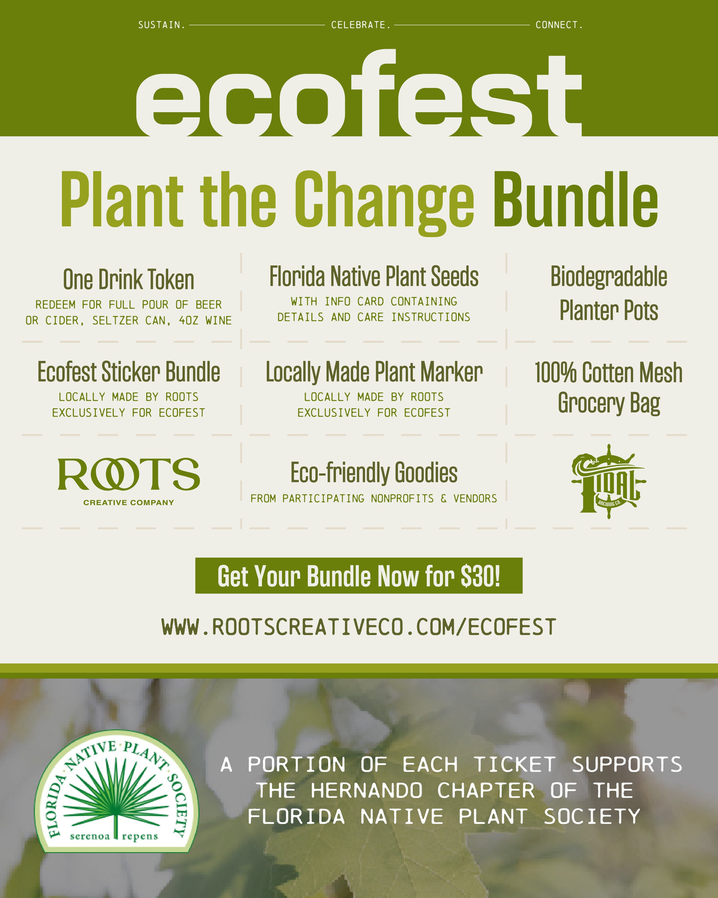 This initiative was born from our shared love for the outdoors and our commitment to protecting our local natural resources. Through special events and limited-edition beers, we aim to raise awareness and support for conservation efforts, wildlife habitats, and water quality in our community. Learn more at www.tidalbrewingfl.com/tfac. Tide for a Cause and Ecofest are proudly co-presented by Roots Creative Co. and Tidal Brewing Co.